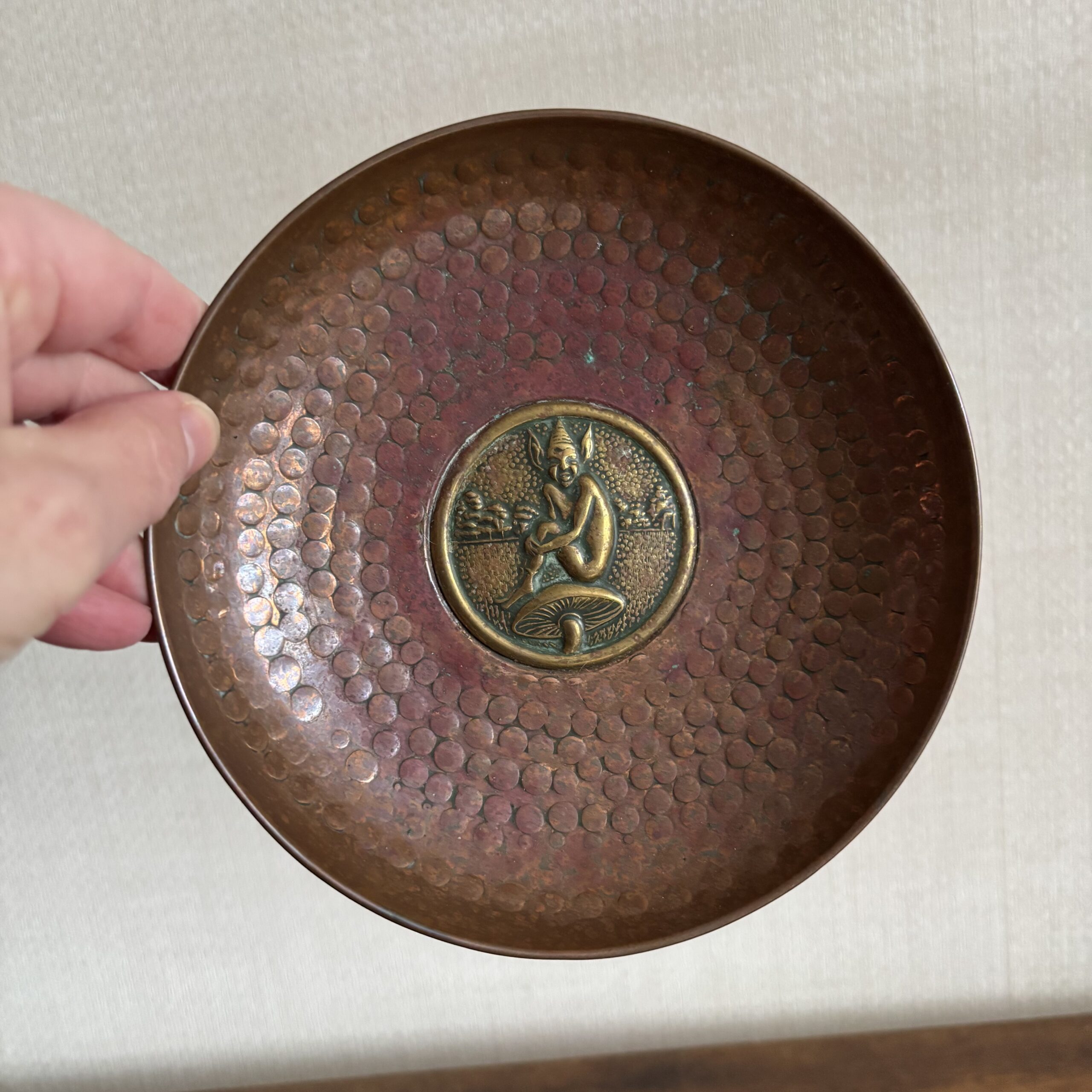 Hammered Copper Dish With Brass Pixie Centre