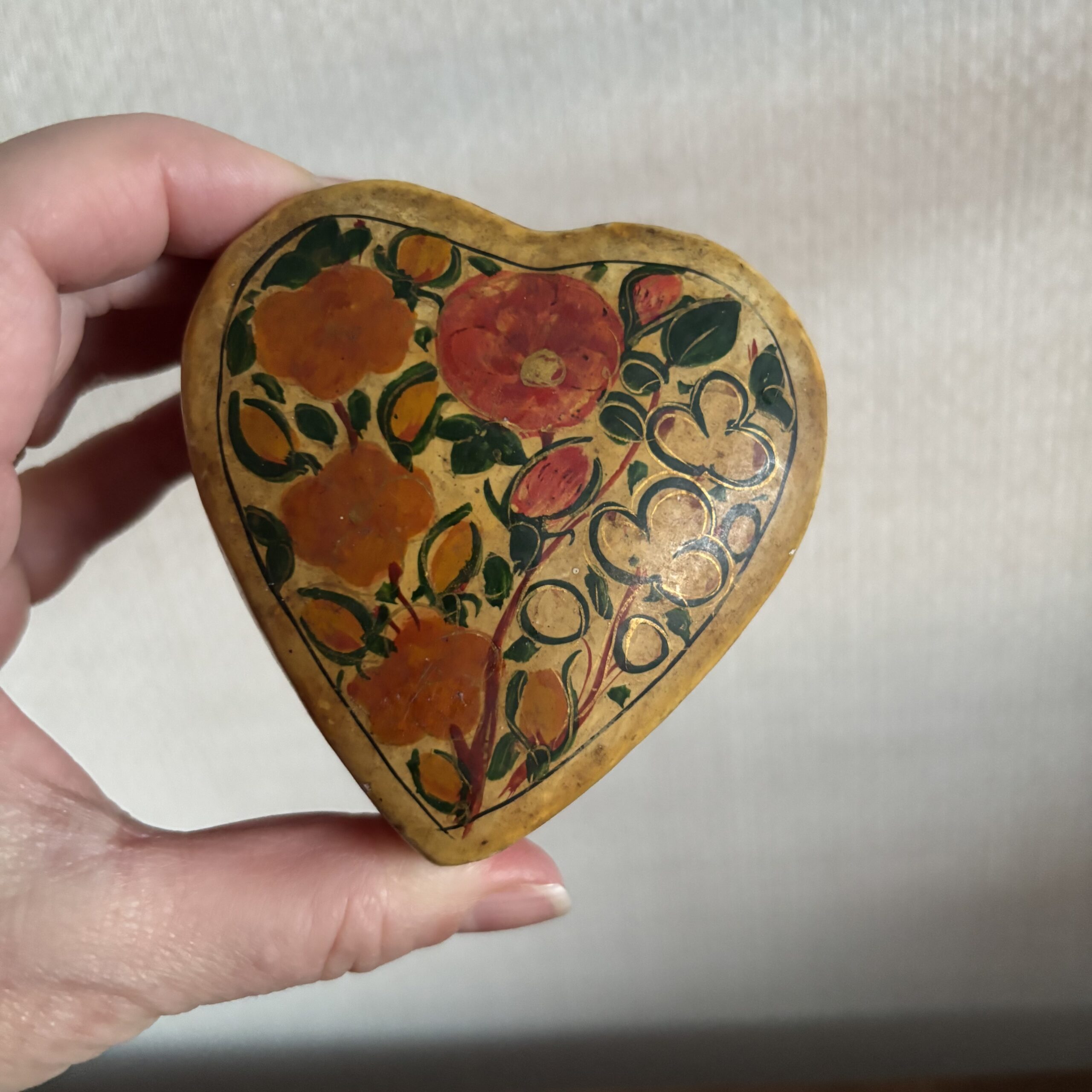 Papier-mâché Heart Shaped Box Has a weathered look – would benefit from a gentle clean