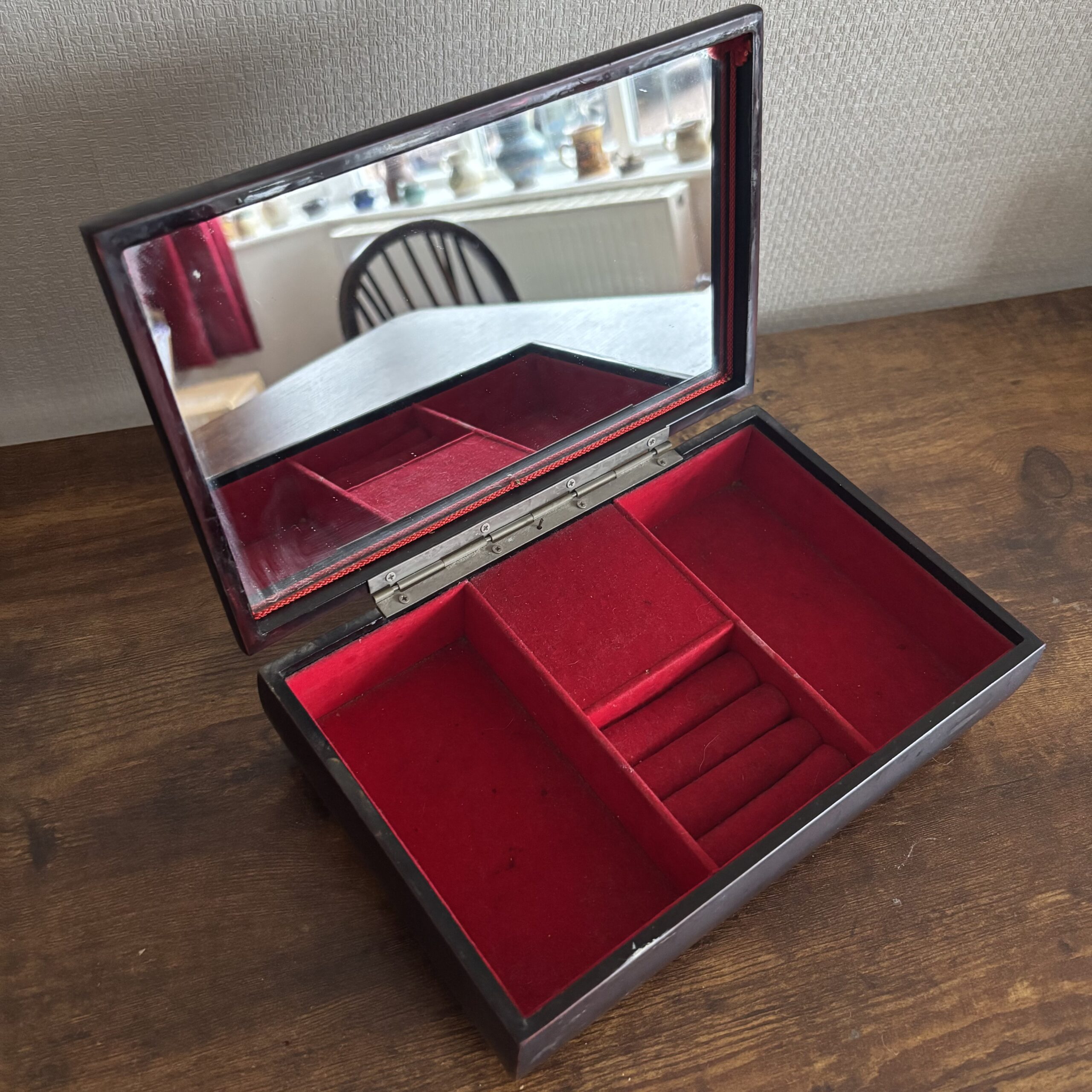 Deep red laquered box, with a mirror inside.